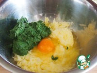 Картофель натереть на мелкой терке. Если картофель дает очень много сока, то нужно слегка отжать лишнюю влагу, но не досуха. Добавить соль, яйцо, шпинат и муку. |