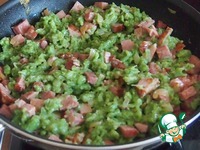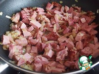 В большой сковороде на раскаленном масле поджарить лук. Затем к нему добавить мясо и немного обжарить. |
