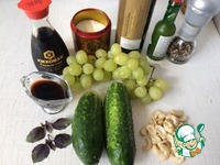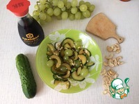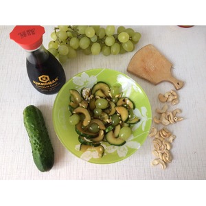 Описание: Простой рецепт салата, приготовленного из огурцов, винограда кишмиш и орешков.