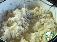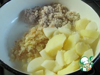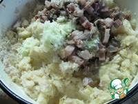 В посуду высыпать лук, положить отжатый мякиш и отваренный без соли картофель. |