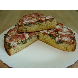 Достаем пирог из духовки и посыпаем чесноком. Выкладываем зелень со сметаной. Сверху - помидоры. Смазываем сметаной. Ставим пирог в духовку ещё на 15-20 минут.