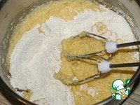 Постепенно ввести половину муки с разрыхлителем, продолжая взбивать тесто, добавить половину питьевого йогурта, затем снова муку и остатки йогурта. |