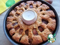 Смазать форму растительным маслом (у меня тефлоновая 22 см в диаметре). Для придания кольца я ставлю в центр керамический стаканчик, который тоже обмазать маслом. Выложить тесто вокруг. |