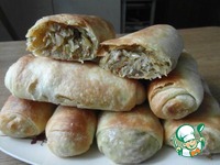 Для начинки -обжарить фарш со специями -добавить капусту (если надо, можно промыть) -жарить не прикрывая крышкой, что бы вся влага испарилась... -кладем начинку на раскатанное тесто... |