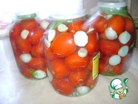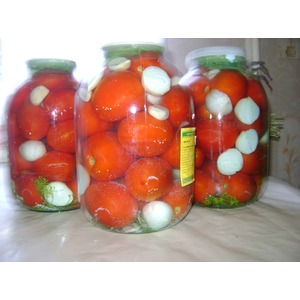 На дно пропаренных банок кладём смородиновый лист и чеснок, затем плотно укладываем помидоры, перекладывая луком. |