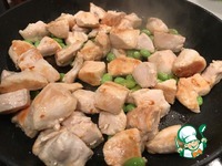 Обжарьте курицу до полуготовности на кунжутном масле. Добавьте очищенные бобы. Посолите. |