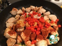 Всыпьте к курице специи. Копченую паприку, куркуму, чеснок, чили. Перемешайте и готовьте еще пару минут. |