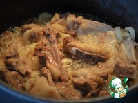 Ребра вымыть, обсушить, нарезать. На растительном масле обжарить ребра, до румяности, минут 10-12. Добавить лук, полукольцами, обжарить 5 минут. |