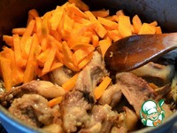 Добавить морковь, нарезанную брусочками. Жарить 10 минут на среднем огне. |