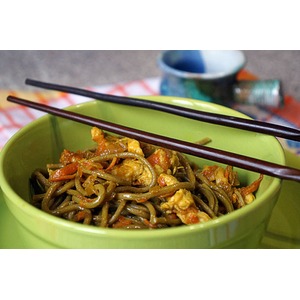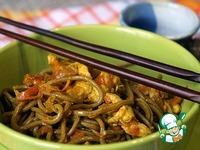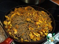 Всыпать куркуму, посолить, поперчить, перемешать. Жарить до готовности курицы – минут 5. Отправить в сковороду готовую гречневую лапшу. Влить соус терияки, перемешать. |