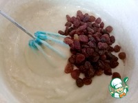 Постепенно добавляем просеянную муку, перемешать. Добавить изюм и еще раз перемешать. |