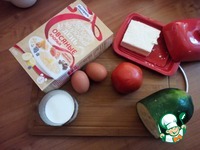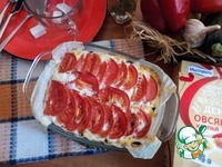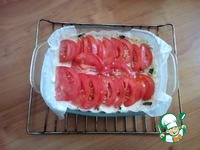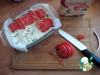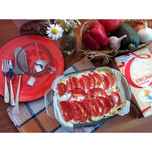 Выкладываем в форму яично-сливочную смесь с овощами и овсянкой, разравнивая по форме. Помидор тонко режем и укладываем сверху будущей запеканки. |