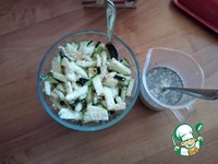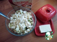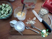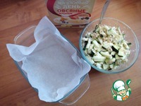 В посуду с цуккини выкладываем хлопья, чеснок. Всё перемешиваем и заливаем сливочно-яичной смесью. Даём постоять минут 5, чтобы хлопья разбухли. |