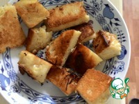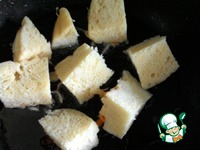 Для подачи нужно порезать булочку на кусочки 3-4 см и поджарить до хрустящей корочки. Я это делаю на растительном масле. Моя бабушка всегда делела это на смальце. |