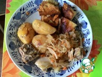 Примерно так. Выкладываем на тарелку все ингридиенты: мясо, картофель, капусту и поджаренные булочки (см. последнее фото) |
