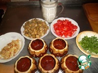 В сметану добавляем около 100 мл бульона или кипяченой воды. Тщательно перемешиваем. Помидоры режем мелкими кубиками, кинзу мелко рубим и начинаем загружать горшочки... |