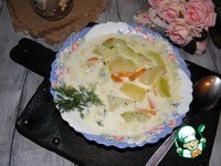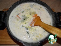 Описание: Суп молочный, овощной! Нежный, бархатный такой! С капустой, кабачками! Любимый очень нами! Друзья, Вам я тоже его предлагаю! До края тарелочки всем наливаю!