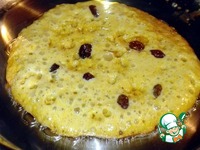 Теста на каждый блин наливала по три столовых ложки. Сверху насыпала изюм. Блинчики получились мягкими и ароматными. |