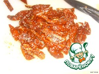 В сковороду кладём масло. Когда масло нагрелось закладываем наши помидорчики, чесночную пасту и чили, и слегка обжариваем. |