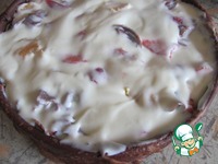 Укладываем мешочки в форму сверху на крем и слегка утапливаем. Так поступаем со всеми блинами, оставив один. |