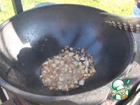 На сильно разогретом казане вытапливаем жир из предварительно порезанного на кусочки сала. Шкварки удаляем. |