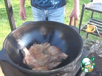 Настало время мяса. Опускаем наши порционные кусочки в раскаленный жир и обжариваем до золотистой корочки. |