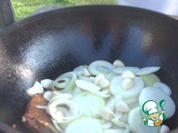 Добавляем репчатый лук, закрываем казан крышкой. Убавляем огонь под казаном до минимума и оставляем тушиться на 30 минут. |