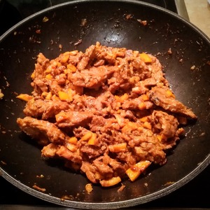 6. После закипания выкладываем мясо и обжариваем с каждой стороны по 2-3 минуты