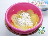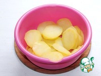 1. Очищенный картофель нарезаем тонкими кружочками (~0,5 см) и отвариваем в подсоленной воде до полуготовности. Затем отвар сливаем, картофель выкладываем в миску. |