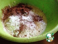 Муку смешать с разрыхлителем и солью. Мучную смесь добавить к яично-масляной, ввести корицу, какао. |