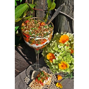 Почему трайфл обязательно должен быть десертом? Предлагаю вам вариант несладкого трайфла с сочными сезонными томатами, ароматным болгарским перцем и невероятно вкусной злаковой гранолой!