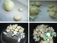 Лук нарезать небольшими кубиками, чеснок слайсами. Обжарить в сотейнике в растительном масле на среднем огне, до прозрачности. Помешивать периодически. |