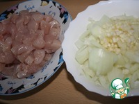 Нарезать мелко куриное филе. Лук полукольцами и чеснок мелко |