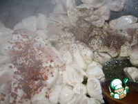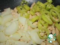 Разогреваем масло и обжариваем курицу с добавлением красного и черного перца. Обжариваем около 8 минут. |