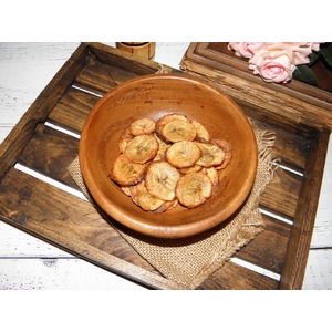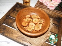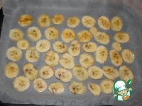 Противень застелить пергаментной бумагой (или специальным ковриком) выложить бананы в один слой поставить в разогретую духовку (у меня в районе 190-200 градусов) на время которое зависит от температуры и на сколько поджаристыми вы хотите видеть чипсы. Желательно хотя бы один раз перевернуть чипсы во время приготовления (но не обязательно), приблизительно запекайте чипсы 20-25 минут, пока они не станут хрустящими. Следите за чипсами, так как они могут подгореть (можно делать и не очень хрустящими), в общем влага должна уйти. |