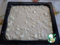 На противень, застеленный пергаментом выкладываем тесто. Равномерно распределяем. Размеры моего противня 34 х 31 см. |