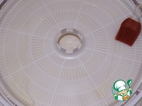 Выложить томатное пюре слоем 0,5-1 см. Поставить в сушилку на температуру 50 градусов на 4-6 часов. Как видим, можно было слой сделать потолще. |