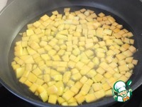 Тыкву очищаем, нарезаем мелкими кубиками. Всыпаем в сковороду, наливаем воду, так чтобы вода покрывала кубики. Готовим на сильном огне, пока не выпарится вода. |