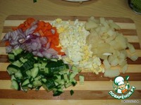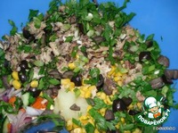 Описание: Надумала сделать какой-нибудь салат. Просмотрела все, что у меня есть в наличии, и вот, что получилось. Может быть, и есть на сайте, что-то похожее или вообще такой же (хотя сомневаюсь), я не стала тратить время, искать и проверять, а тем более, не искала на других. Салат собственной моей фантазии.