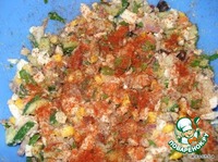 Все складываем в миску, добавляем кукурузу, солим, перчим, посыпаем паприкой, поливаем растительным маслом, перемешиваем и выкладываем в салатницу. |