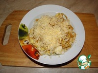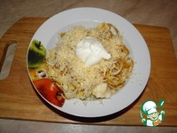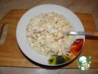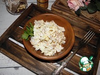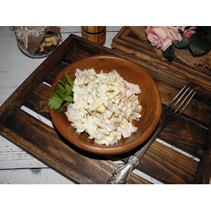 Салат готов. Особенность этого салата заключается в добавлении большого кол-ва яиц, сюда идут и блинчики, и отварные яйца. Буду рада, если Вам такое сочетание понравится! |