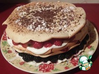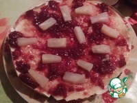 Накрываем вторым блином, смазываем вишневым вареньем и кладем опять немного ананасов. |