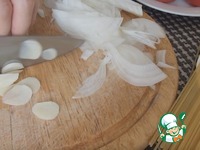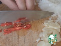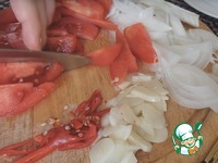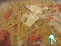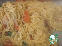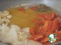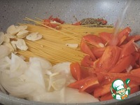 Спагетти выложить в центре сковороды. Вокруг выложит лук, чеснок, перец чили, помидоры, сухой базилик. |