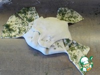 Также рисуем дисковым ножом лучи, вырезаем круг большего диаметра, складываем обрезанные края на наш центр и сверху накрываем полосками теста |