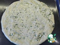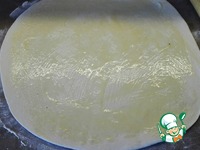 Берём одну половинку и раскатаем в тонкий круг диаметром около 45-50 см. Смажем растопленным маргарином или сливочным маслом. |