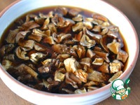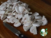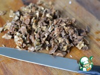 Воду с грибов слить, даже слегка грибы отжать от воды. Нарезать на кусочки. |