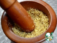 Орехи измельчаем ножом или в ступке. Если отправить орехи в измельчитель, то получится слишком мелко, а нам этого не нужно. |