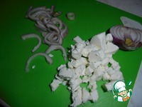 Фету нарезать небольшими кубиками. Репчатый лук нарезать тонкими полукружочками. |