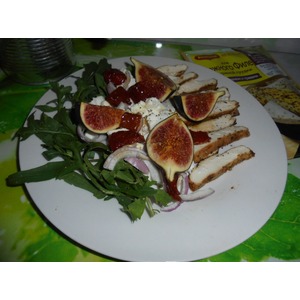 Описание: Оригинальный салат с куриной грудкой, обжаренной в листах Магги с чесноком и травами, инжиром, сыром фета. Неповторимый вкус этому салату придает инжир.