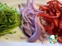 Огурцы и перец порезать соломкой Лук порезать "перышками" |
